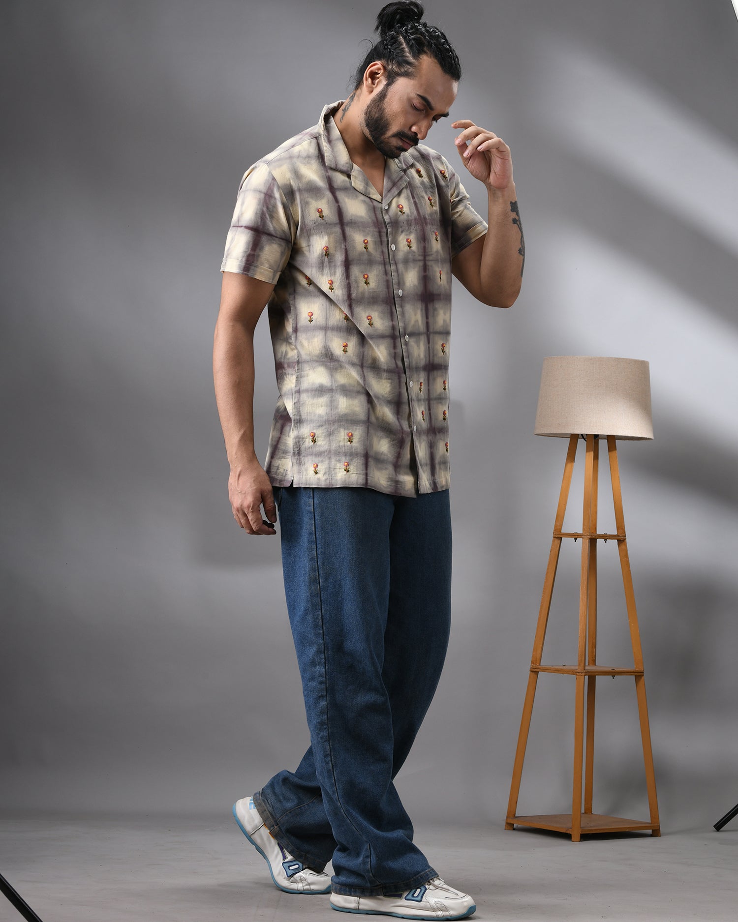 Natural Dye Grid - With Parsee Hand Embroidery Half Sleeve Cuban Collar Shirt 100% Cotton for Men (Unisex)